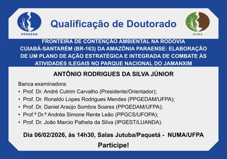 Antônio Rodrigues da Silva Júnior apresentará no dia 6 de fevereiro de 2026, às 14h30, em NUMA Acadêmico, a sua pesquisa intitulada "FRONTEIRA DE CONTENÇÃO AMBIENTAL NA RODOVIA CUIABÁ-SANTARÉM (BR-163) DA AMAZÔNIA PARAENSE: elaboração de um Plano de Ação Estratégica e Integrada de Combate as Atividades Ilegais no Parque Nacional do Jamanxim", desenvolvida sob orientação acadêmica do Prof. Dr. André Cutrim Carvalho. A banca será composta ainda pelo Prof. Dr. Ronaldo Lopes Rodrigues Mendes, Prof. Dr. Daniel Araújo Sombra Soares, Prof.ª Dr.ª Andréa Simone Rente Leão (Programa de Pós-Graduação em Ciências da Sociedade da Universidade Federal do Oeste do Pará) e Prof. Dr. João Marcio Palheta da Silva (Instituto Politécnico de Gestão, Logística e Transportes da Universidade de Luanda).