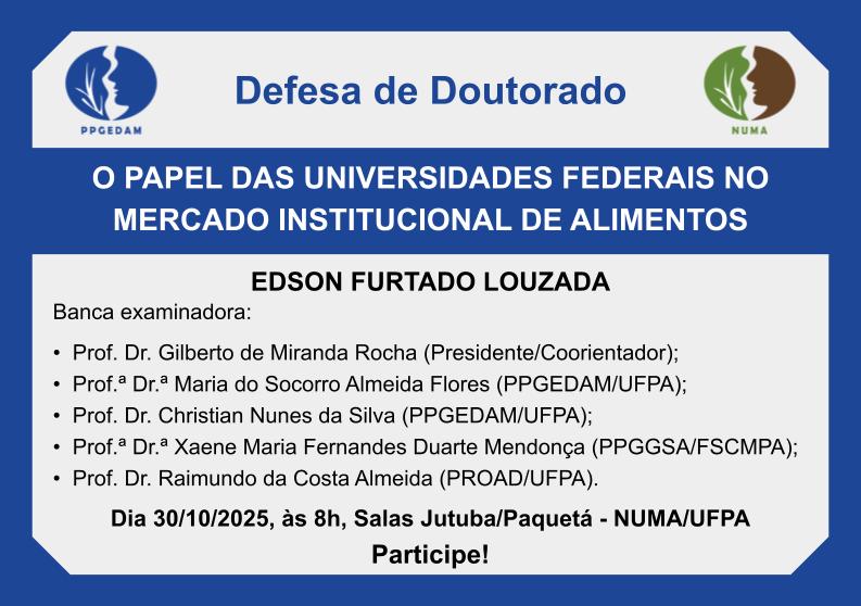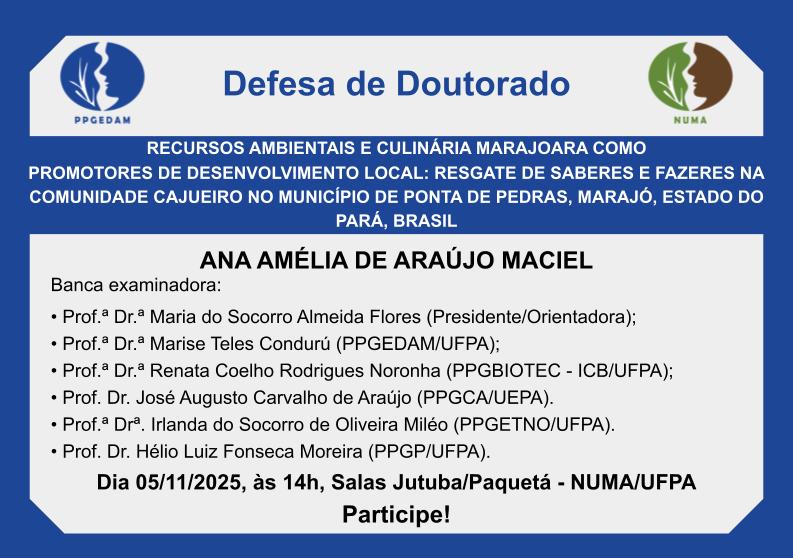 Ana Amélia de Araújo Maciel apresentará no dia 5 de novembro de 2025, às 14h, em NUMA Acadêmico, a sua pesquisa intitulada "RECURSOS AMBIENTAIS E CULINÁRIA MARAJOARA COMO PROMOTORES DE DESENVOLVIMENTO LOCAL: resgate de saberes e fazeres na comunidade Cajueiro no município de Ponta de Pedras, Marajó, estado do Pará, Brasil ", desenvolvida sob orientação acadêmica da Prof.ª Dr.ª Maria do Socorro Almeida Flores. A banca será composta ainda pela Prof.ª Dr.ª Marise Teles Condurú (PPGEDAM/UFPA); Prof.ª Dr.ª Renata Coelho Rodrigues Noronha (PPGBIOTEC - ICB/UFPA); Prof. Dr. José Augusto Carvalho de Araújo (PPGCA/UEPA); Prof.ª Drª. Irlanda do Socorro de Oliveira Miléo (PPGETNO/UFPA); e Prof. Dr. Hélio Luiz Fonseca Moreira (PPGP/UFPA).