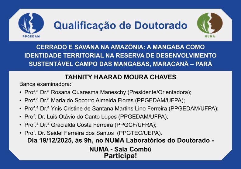 TAHNITY HAARAD MOURA CHAVES apresentará no dia 19 de dezembro de 2025, às 9h, em NUMA Laboratórios, a sua pesquisa intitulada "Cerrado e savana na Amazônia: A mangaba como identidade territorial na reserva de desenvolvimento sustentável Campo das Mangabas, Maracanã – Pará", desenvolvida sob orientação acadêmica da Prof.ª Dr.ª Rosana Quaresma Maneschy. A banca será composta ainda pela Prof.ª Dr.ª Maria do Socorro Almeida Flores, Prof. Dr. Luis Otávio do Canto Lopes, Prof.ª Dr.ª Gracialda Costa Ferreira (Programa de Pós-graduação em Ciências Florestais - PPGCF/UFRA) e Prof. Dr. Seidel Ferreira dos Santos (Programa de Pós-Graduação em Tecnologia, Recursos Naturais e Sustentabilidade na Amazônia - PPGTEC/UEPA).