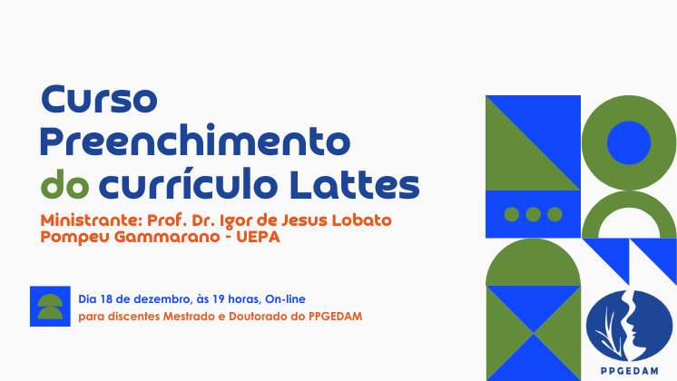 Atendendo a uma demanda apresentada pelos próprios estudantes, o Programa de Pós-Graduação em Gestão dos Recursos Naturais e Desenvolvimento Local na Amazônia (PPGEDAM/NUMA/UFPA) promoverá o Curso de Preenchimento do Currículo Lattes, que será ministrado pelo Prof. Dr. Igor de Jesus Lobato Pompeu Gammarano (UEPA). A atividade ocorrerá no dia 18 de dezembro, às 19h, em formato on-line, e é destinada aos discentes de Mestrado e Doutorado do programa.