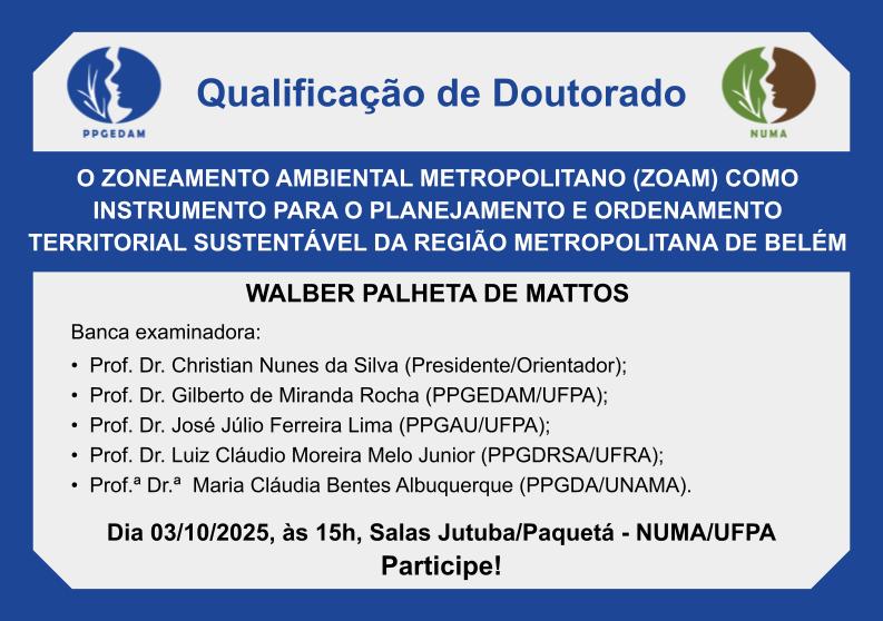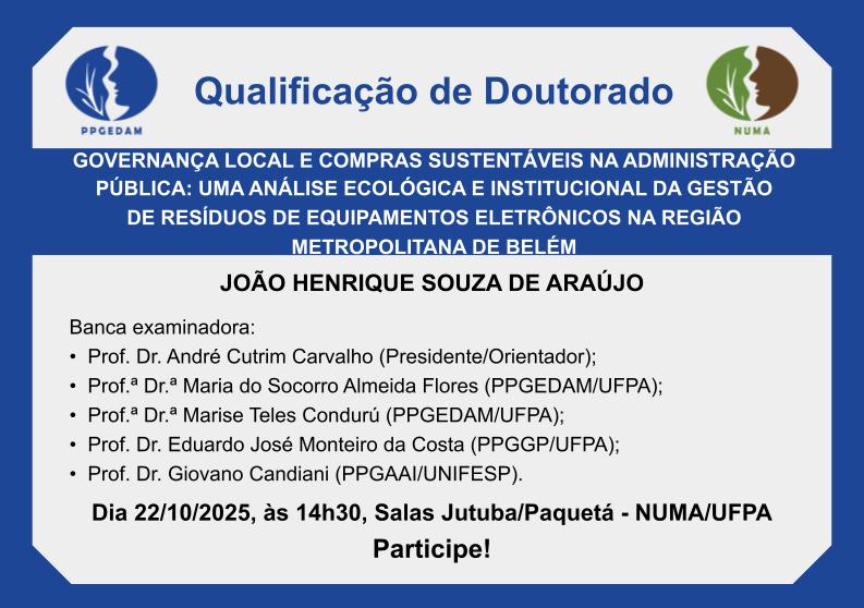 O Núcleo de Meio Ambiente da Universidade Federal do Pará (NUMA/UFPA) já está mobilizado para a 30ª Conferência das Nações Unidas sobre Mudanças Climáticas (COP30), que será realizada em Belém, em novembro de 2025. Para este processo, estamos organizando e participando de uma série de atividades conforme relação abaixo, e convidamos toda a sociedade para participar:
