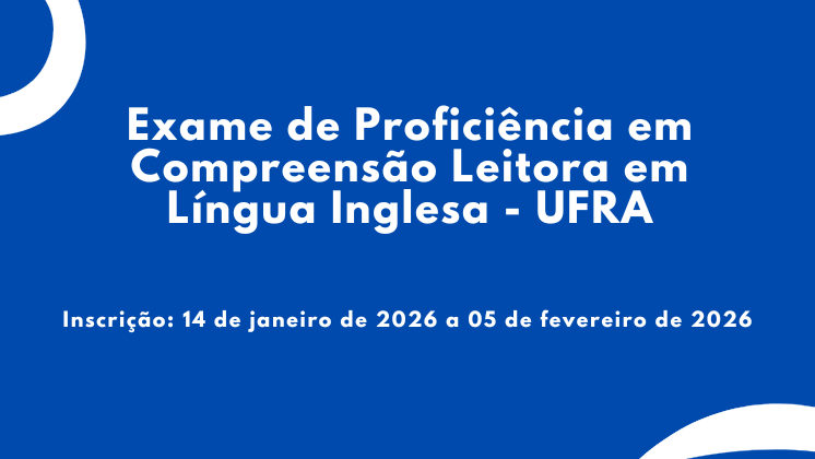 As inscrições para a aplicação do Exame de Proficiência em Compreensão Leitora em Língua Inglesa, ofertado pelo PROELI/UFRA, serão realizadas exclusivamente via internet, observado o horário de Brasília, no endereço eletrônico https://proeli.ufra.edu.br/ , no período de 14 de janeiro de 2026 a 05 de fevereiro de 2026, até às 23h59.