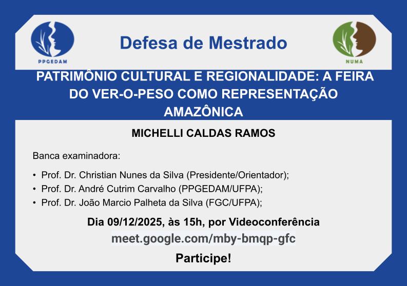 Michelli Caldas Ramos apresentará no dia 9 de dezembro de 2025, às 15h, em Videoconferência, a sua pesquisa intitulada "PATRIMÔNIO CULTURAL E REGIONALIDADE: A FEIRA DO VER-O-PESO COMO REPRESENTAÇÃO AMAZÔNICA", desenvolvida sob orientação acadêmica do Prof. Dr. Christian Nunes da Silva. A banca será composta ainda pelo Prof. Dr. André Cutrim Carvalho e Prof. Dr. João Marcio Palheta da Silva (FGC/UFPA).