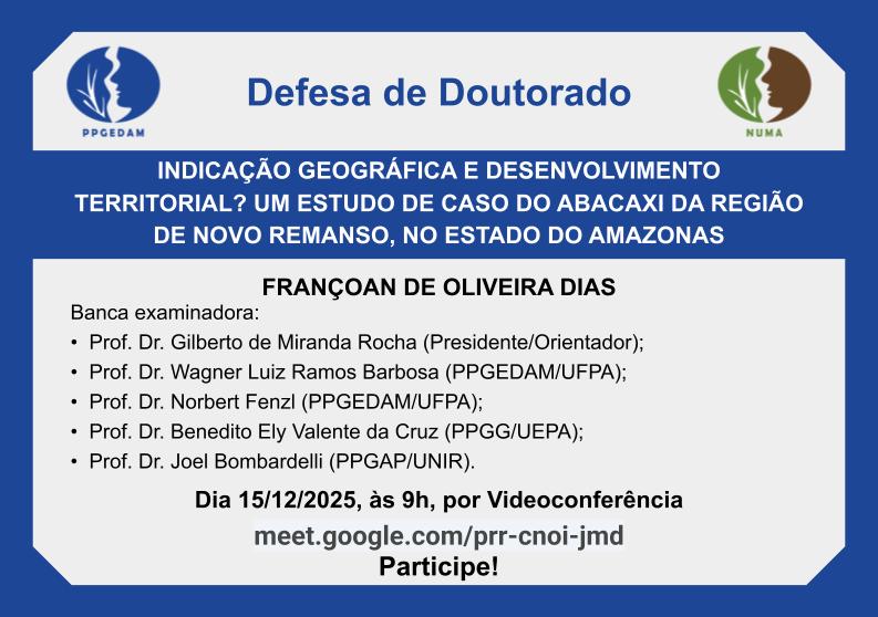 Françoan de Oliveira Dias apresentará no dia 15 de dezembro de 2025, às 9h, em NUMA Acadêmico, a sua pesquisa intitulada "INDICAÇÃO GEOGRÁFICA E DESENVOLVIMENTO TERRITORIAL? Um estudo de caso do abacaxi da região de Novo Remanso, no estado do Amazonas.", desenvolvida sob orientação acadêmica do Prof. Dr. Gilberto de Miranda Rocha. A banca será composta ainda pelo Prof. Tit. Dr. Wagner Luiz Ramos Barbosa, Prof. Dr. Norbert Fenzl, Prof. Dr. Benedito Ely Valente da Cruz (Programa de Pós-Graduação em Geografia/UEPA) e Prof. Dr. Joel Bombardelli (Programa de Pós-Graduação em Administração Pública/UNIR).
