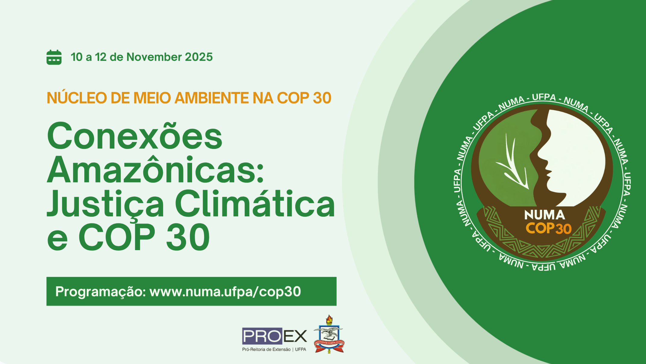 O Núcleo de Meio Ambiente da Universidade Federal do Pará (NUMA/UFPA) promove, entre os dias 10, 11 e 12 de novembro de 2025, o evento “Conexões Amazônicas: Justiça Climática e COP 30”, uma iniciativa internacional que integra os debates da COP 30, sediada em Belém, à reflexão acadêmica, científica e social sobre os desafios da Amazônia e do planeta. O evento será presencial no auditório do NUMA e terá transmissão pelo Youtube do NUMA.