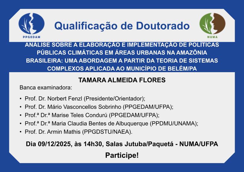 Tamara Almeida Flores apresentará no dia 9 de dezembro de 2025, às 14h30, em NUMA Acadêmico, a sua pesquisa intitulada "ANÁLISE SOBRE A ELABORAÇÃO E IMPLEMENTAÇÃO DE POLÍTICAS PÚBLICAS CLIMÁTICAS EM ÁREAS URBANAS NA AMAZÔNIA BRASILEIRA: UMA ABORDAGEM A PARTIR DA TEORIA DE SISTEMAS COMPLEXOS APLICADA AO MUNICÍPIO DE BELÉM/PA", desenvolvida sob orientação acadêmica do Prof. Dr. Norbert Fenzl. A banca será composta ainda pelo Prof. Dr. Mário Vasconcellos Sobrinho, Prof.ª Dr.ª Marise Teles Condurú, Prof.ª Dr.ª Maria Claudia Bentes de Albuquerque (Programa de Pós-Graduação em Desenvolvimento e Meio Ambiente Urbano (PPDMU/UNAMA) e Prof. Dr. Armin Mathis (Programa de Pós-Graduação em Desenvolvimento Sustentável do Trópico Úmido - PPGDSTU/NAEA).