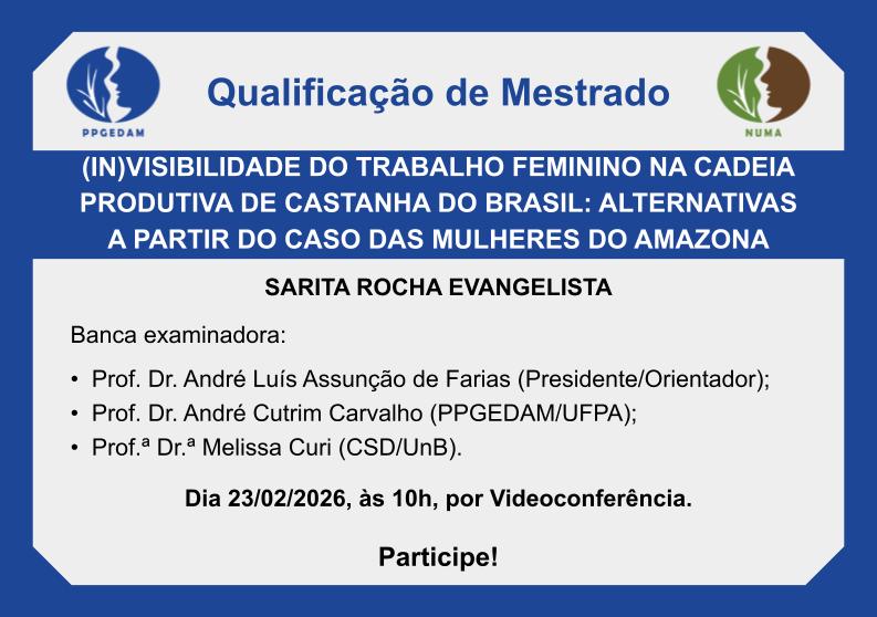 Sarita Rocha Evangelista apresentará no dia 23 de fevereiro de 2026, às 10h, em Videoconferência, a sua pesquisa intitulada "(In)visibilidade do Trabalho Feminino na Cadeia Produtiva de Castanha do Brasil: alternativas a partir do caso das mulheres do Amazonas.", desenvolvida sob orientação acadêmica do Prof. Dr. André Luís Assunção de Farias. A banca será composta ainda pelo Prof. Dr. André Cutrim Carvalho e Prof.ª Dr.ª Melissa Curi (Centro de Desenvolvimento Sustentável de Brasília - CSD/UnB)