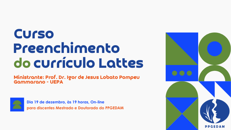 Atendendo a uma demanda apresentada pelos próprios estudantes, o Programa de Pós-Graduação em Gestão dos Recursos Naturais e Desenvolvimento Local na Amazônia (PPGEDAM/NUMA/UFPA) promoverá o Curso de Preenchimento do Currículo Lattes, que será ministrado pelo Prof. Dr. Igor de Jesus Lobato Pompeu Gammarano (UEPA). A atividade ocorrerá no dia 19 de dezembro, às 19h, em formato on-line, e é destinada aos discentes de Mestrado e Doutorado do programa.