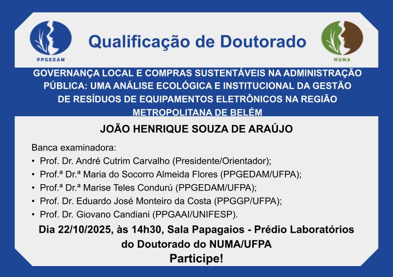 João Henrique Souza de Araújo apresentará no dia 22 de outubro de 2025, às 14h30, em NUMA, a sua pesquisa intitulada "GOVERNANÇA LOCAL E COMPRAS SUSTENTÁVEIS NA ADMINISTRAÇÃO PÚBLICA: uma análise ecológica e institucional da gestão de resíduos de equipamentos eletroeletrônicos na Região Metropolitana de Belém", desenvolvida sob orientação acadêmica do Prof. Dr. André Cutrim Carvalho. A banca será composta ainda pela Prof.ª Dr.ª Maria do Socorro Almeida Flores, Prof.ª Dr.ª Marise Teles Condurú, Prof. Dr. Eduardo José Monteiro da Costa (Programa de Pós-Graduação em Gestão Pública - PPGGP/UFPA) e Prof. Dr. Giovano Candiani (Programa de Pós-Graduação em Análise Ambientais Integrada - PPGAAI/UNIFESP).