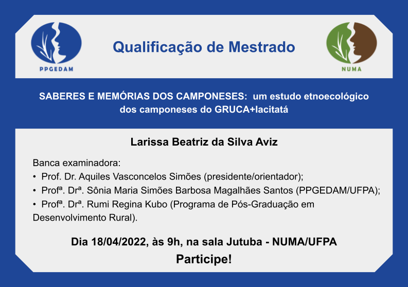 Juliana Fernanda Monteiro de Souza apresentará no dia 1.º de dezembro de 2022, às 15h, no NUMA/UFPA, a sua pesquisa intitulada "O PAPEL DA GESTÃO AMBIENTAL NAS INSTITUÇÕES BANCÁRIAS NO COMBATE AO DESMATAMENTO NO ESTADO DO PARÁ: uma proposta de Nota Técnica para o Município de Parauapebas/PA", desenvolvida sob orientação acadêmica do Prof. Dr. André Cutrim Carvalho. A banca será composta ainda pela Prof.ª Dr.ª Sildiane Martins Cantanhêde e Prof.ª Dr.ª Gisalda Carvalho Filgueiras (FACECON/ICSA/UFPA).
