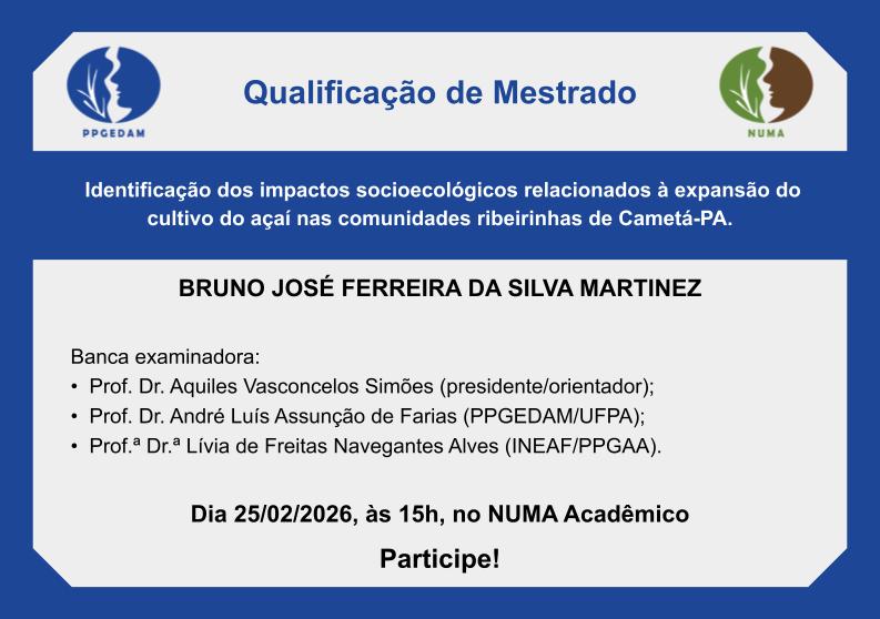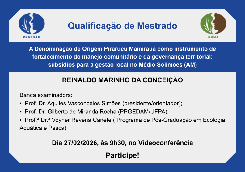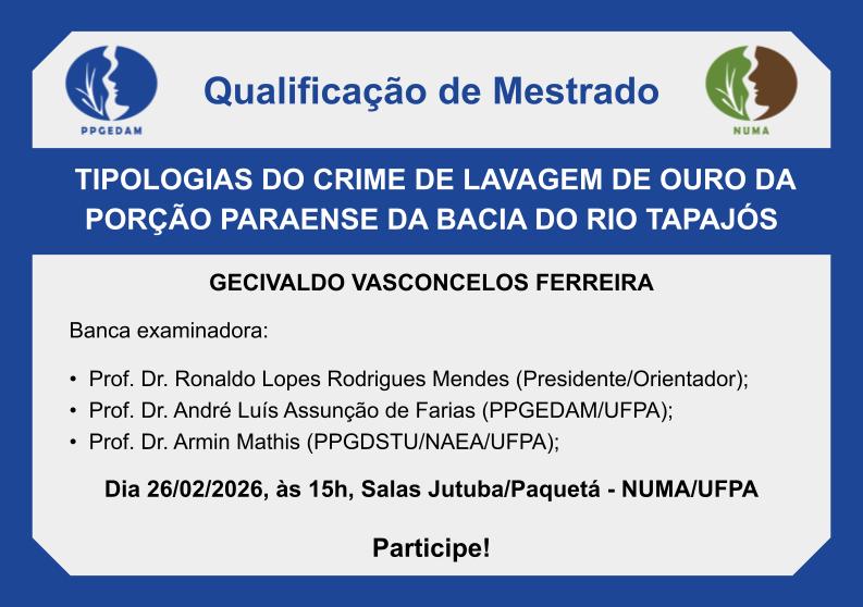 Gecinaldo Vasconcelos Ferreira apresentará no dia 26 de fevereiro de 2026, às 15h, em NUMA Acadêmico, a sua pesquisa intitulada "TIPOLOGIAS DO CRIME DE LAVAGEM DE OURO DA PORÇÃO PARAENSE DA BACIA DO RIO TAPAJÓS", desenvolvida sob orientação acadêmica do Prof. Dr. Ronaldo Lopes Rodrigues Mendes. A banca será composta ainda pelo Prof. Dr. André Luís Assunção de Farias e Prof. Dr. Armin Mathis (Programa de Pós-Graduação em Desenvolvimento Sustentável do Trópico Úmido – PPGDSTU/NAEA/UFPA) .